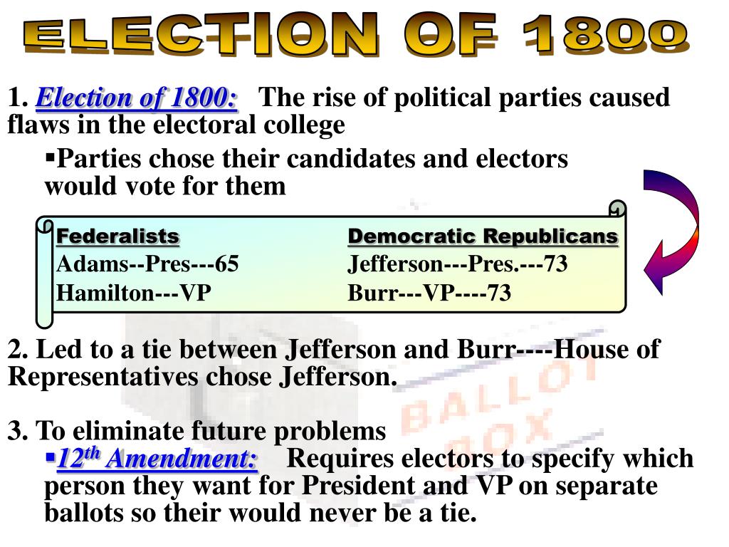 The election of 1800 was a revolutionary election for it significantly altered economics by resulting in lowering and removing taxes like the whiskey tax and government. B a popular vote was taken for a second time. The presidential race was hotly contested between the federalist president john adams and the democratic republican candidate thomas jefferson.