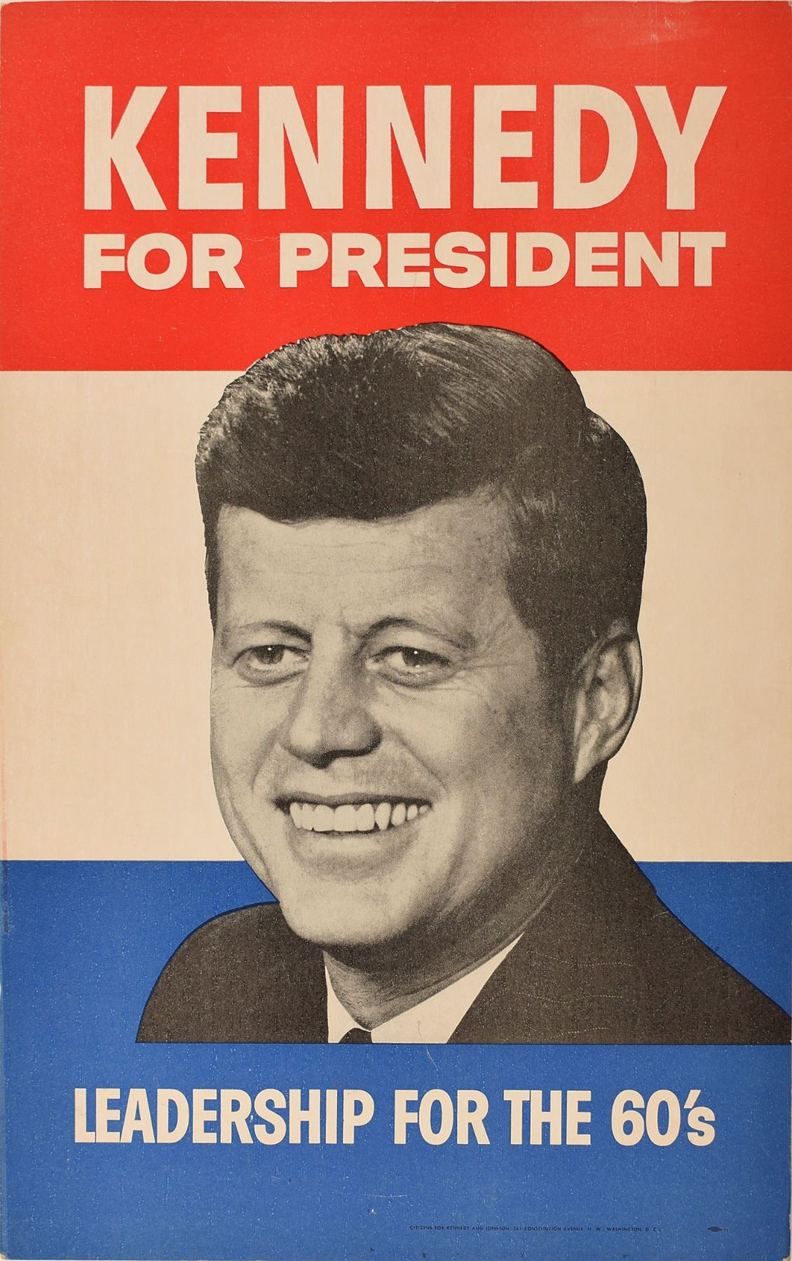 Bold red white and blue poster with large photo of the young president in the center and the campaign slogan leadership for the 60 s.